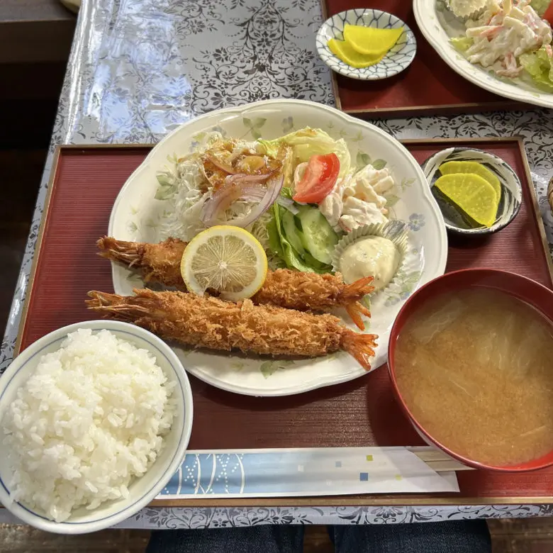 店長こだわりのコーヒーとともに、大ぶりのエビフライ定食などボリューム満点の食事メニューも人気です。