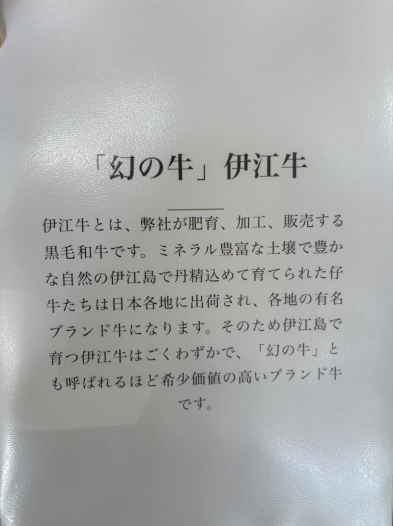 伊江牛は、沖縄県伊江島で育てられている国産黒毛和牛のブランド。生産量が限られていることから「幻の牛」と呼ばれるほど希少性の高い牛肉として知られています。