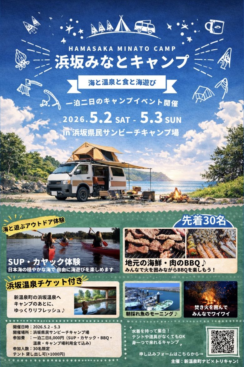 鳥取からすぐの兵庫県新温泉町・浜坂の海辺で、自然・食・温泉を一度に楽しめるキャンプイベント「浜坂みなとキャンプ」を開催します。