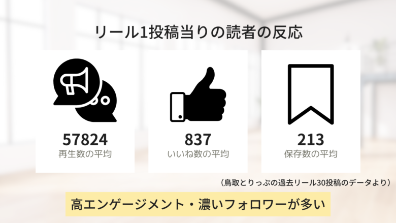 ご参考までに、当アカウントでのエンゲージメントは以下の通りです。(鳥取とりっぷの過去リール38投稿のデータより)